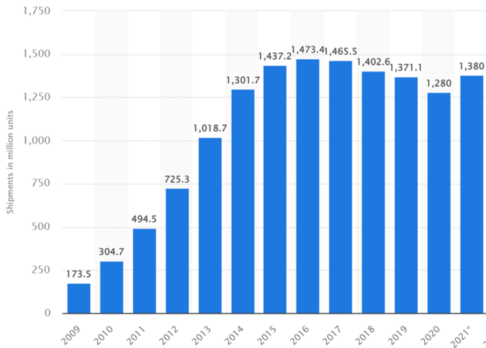 2017年以来全球手机出货量持续下降,2021年略微回温资料来源:Counterpoint
