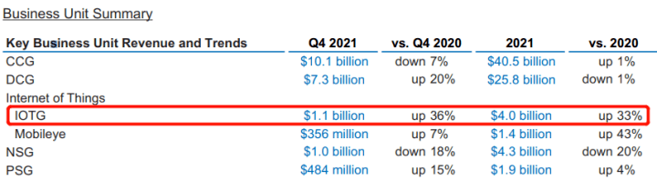 在晶圆代工巨头台积电公布的财报中,2021年其手机业务营收首次被HPC(大型高性能计算)业务超越,面向汽车板块的营收和订单需求也猛增。 图像传感器芯片设计龙头韦尔股份最新财报显示,其半导体业务收入同比增长18%,虽然智能手机CMOS占据营收大头,但业绩增长主要来源于车载CIS与安防CIS,尤其在安防领域实现高达60%的业绩增长。 2021年物联网事业部(IoTG)成为国际半导体巨头英特尔增长最快的业务,同比增长33%,同时汽车自动驾驶业务也增速惊人,反观主营PC终端的CCG部门业绩仅增1个百分点。
