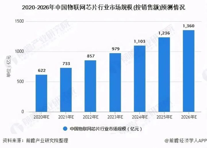 随着传统行业自动化升级,物联网在垂直领域终端用户的渗透率提升,物联网芯片市场快速增长,前瞻产业研究院分析预计,2022年我国物联网芯片市场规模可达857亿元人民币,有望在2024年达到千亿规模,来自Counterpoint的数据显示,中国消耗了全球近60%的蜂窝物联网芯片。