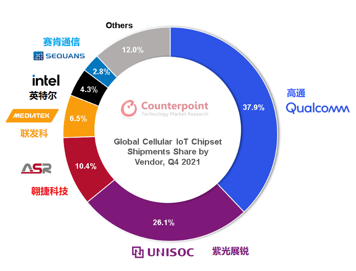 几乎所有物联网终端都需搭载IoT通信芯片,因而通信射频芯片能够直观反映物联网行业的成长周期与终端需求,堪称行业风向标。在Counterpoint发布的全球蜂窝物联网芯片追踪报告中,高通、紫光展锐、翱捷科技、联发科、英特尔、Sequans、华为海思等占据了大部分市场份额。